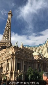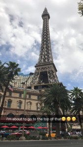 Another attraction on the list was the top of the Eiffel Tower in Paris. I made my way up to the stop (a total of 500-something feet, which is only HALF the size of the actual). The view from the top was absolutely amazing. You literally got to see the whole strip and far beyond. I even got to catch the Bellagio Fountain show from the top! Since the whole top is caged in, they put these little squares in random spots for picture taking. Well, being the crazy that I am, I decided it would be completely worth the risk (and I was right) to stick my hand and whole phone through the hole in order to take a panoramic picture of the whole view. I loved the way it came out so much that I continued on to do it three more times! Talk about nerve wracking right!?