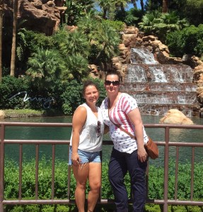 On our way to the first stop, we took a picture in front of the waterfalls at the Mirage to reenact a same picture we took in 2000! Not much has changed considering we both pretty much look exactly the same 🙂