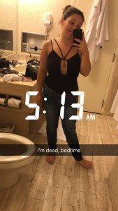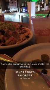 We were going to head to the pool to relax a little bit, but once we laid down we didn’t want to get back up. We hung out in the room for a little bit until we headed down to Treasure Island for dinner. We ate nachos at Señor Frogs, and when we were done there headed to the theater for a CIRQUE DU SOLEIL SHOW. We saw their Mystere show which was definitely weird, but SO AWESOME. One of the employees upgraded our seats for free and we were only FIVE rows from the front!! I would arguably say we had the best seats in the house! It was such a great show and really made me wish I could do things that they could. Maybe if I keep doing yoga I’ll get there 😉