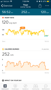 In addition to all of the things I have mentioned above, it is also important to mention that I get a decent amount of sleep every night. I go to bed pretty early — averaging around 10:30-11pm — and wake up on average around 8-8:30am — getting roughly 8 hours of sleep, more or less, every night (thanks FitBit!). Having a regular and healthy sleeping schedule can also contribute to overall health, energy, and your weight loss! Also, you can have your own opinion all you want about yoga, but I burn at least 100 calories in every yoga class, if not almost/over 200. It might just be worth a shot 😉 See some stats from workouts and yoga below!