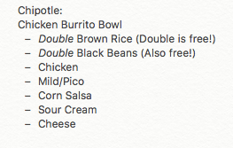 I’m not a huge breakfast person since I can’t eat when I first wake up, so I usually eat a late breakfast/lunch, usually a bagel, around 11:30-noon. Since I wouldn’t have class until mid-morning, this would be good timing for my body of when to eat. I then started to add in a snack 2-3 hours later, which would hold me over until the end of classes when I could eat a meal again. I eat A LOT of Chipotle, so that’s honestly probably how I got a majority of my protein during this time. (Chipotle order pictured below 🙂 ). I googled some healthy recipes and decided to give a few of them a shot (Chicken and Mango Bowls pictured above).
