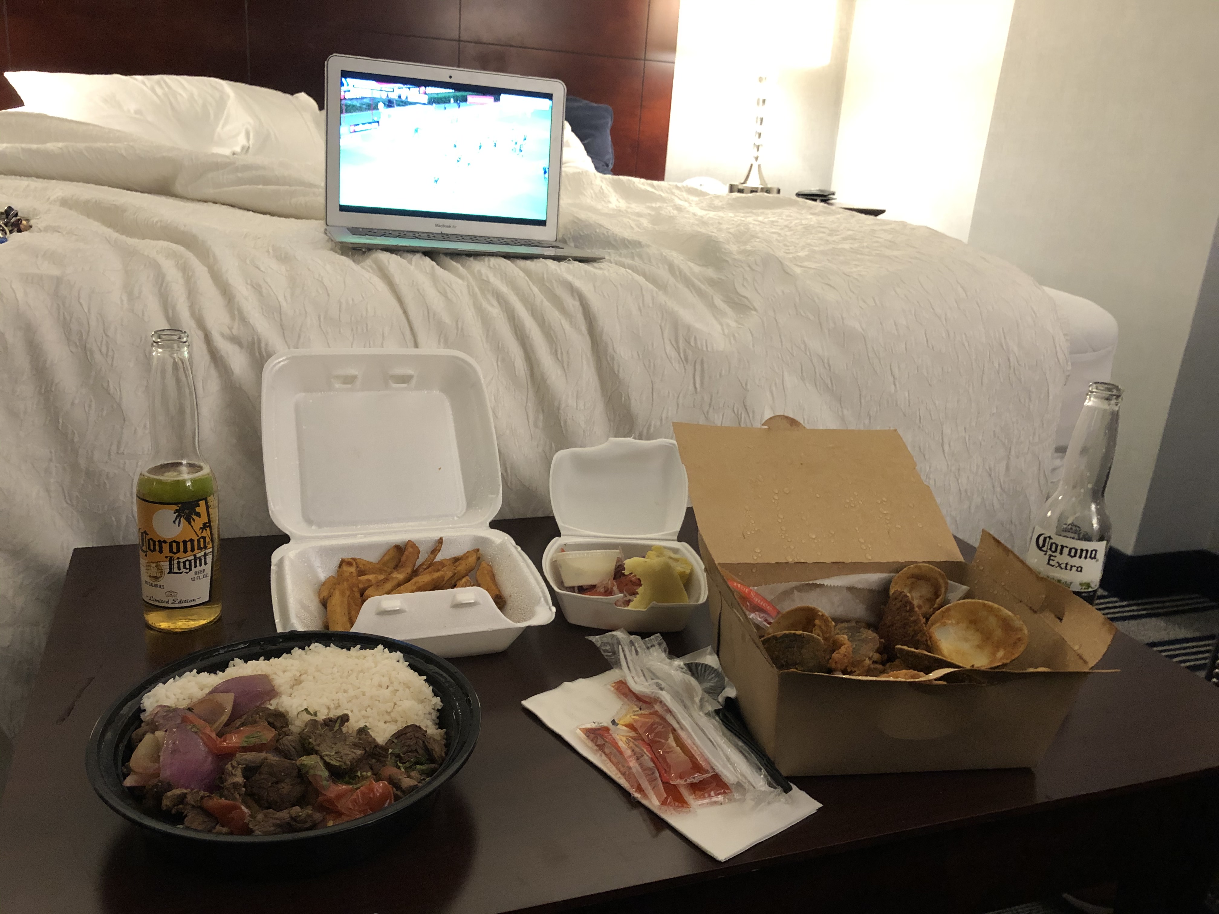 It was recommended to me by a friend to go to Los Andes since they have the best Peruvian food in all of NE. We called to try and make a reservation, and they were only doing a waitlist by then. We headed over to the restaurant and put our names on the list. An hour and 45 minute wait. Noe’s soccer team was playing a game a few hours later, so after some time contemplating in the car, we decided we would just ask for our food to go instead of sitting down in the restaurant. This way we could still try the food, not have to worry about paying $10-12 for our drinks, and enjoy dinner in our hotel room while we watched the game. Our food was ready in about 20 minutes or so, we stopped at a liquor store on the way back to the hotel to grab some beers, and showered and got ready to watch the game.