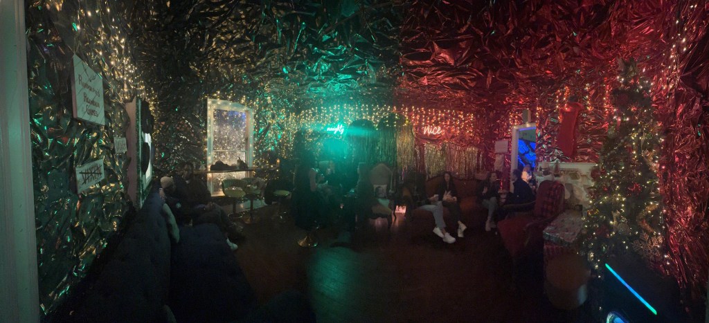 Normally, it’s a bar/lounge. But during this time of the year it’s rebranded into St. Nicks – a nontraditional Christmas experience with themed rooms! Think selfie museum meets small lounge? It was fairly busy, but eventually we got to see and take pictures in all of the rooms. They were SO cute! They also have a seasonal drink menu, but we opted for good ‘ole Hot Chocolate 🙂