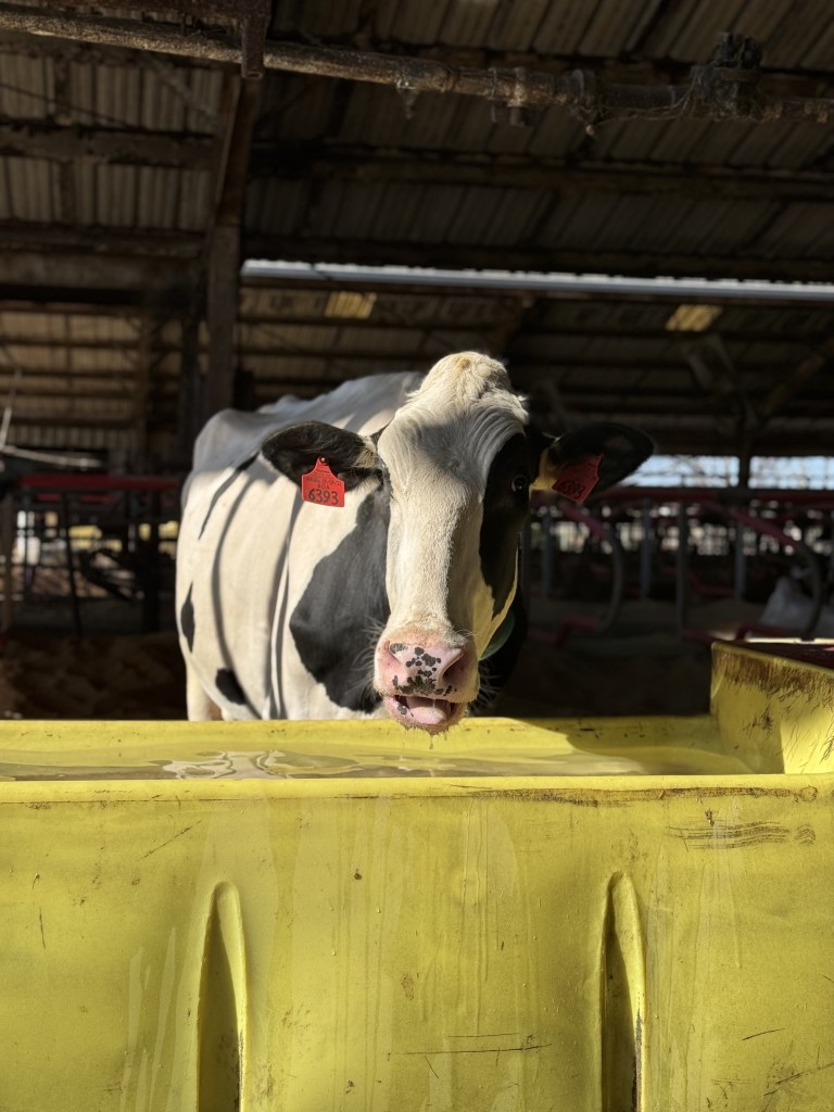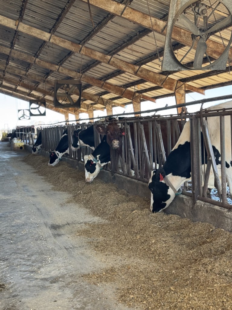We then go to see the cow barn where the cows that do lactate and get milked live. They are essentially free range, allowed to come and go as they please except in case of extreme weather for example. Cows can eat, drink water, lay down in sand beds, relax under the shade, or sun bathe outside any time of day no matter what. Since it was only Izzy and I on this tour, the guide let us walk in the barn a bit to get a closer look at the cows. They were SOOOO cute, and I totally wish we could’ve pet them.