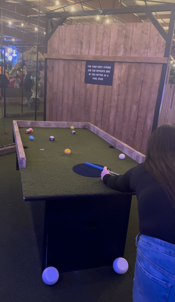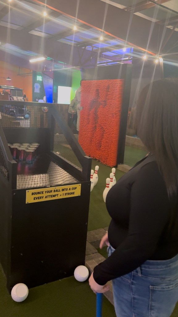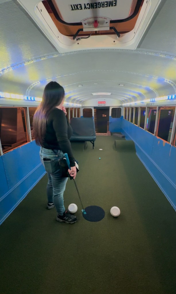 Next stop for the day : Partee Shack! Mini golf, but better. Here we played regular mini golf, but each of the holes is unique. On some, the hole was in between some bowling pins. On others, you bounce the ball like you’re playing beer pong so it comes out a different hole on the other side. Some of the holes even have spinners at the beginning that you spin and may get a reward or a consequence. For example on one of Izzy’s spin, she landed on a spot that said I had to take my first shot with my eyes closed! We even got to do a hole inside of a school bus. It was all very unique and so much fun to do. They have 3 different “courses”, and we did 2 of them. Unfortunately I lost both rounds, so Izzy gets bragging rights there.