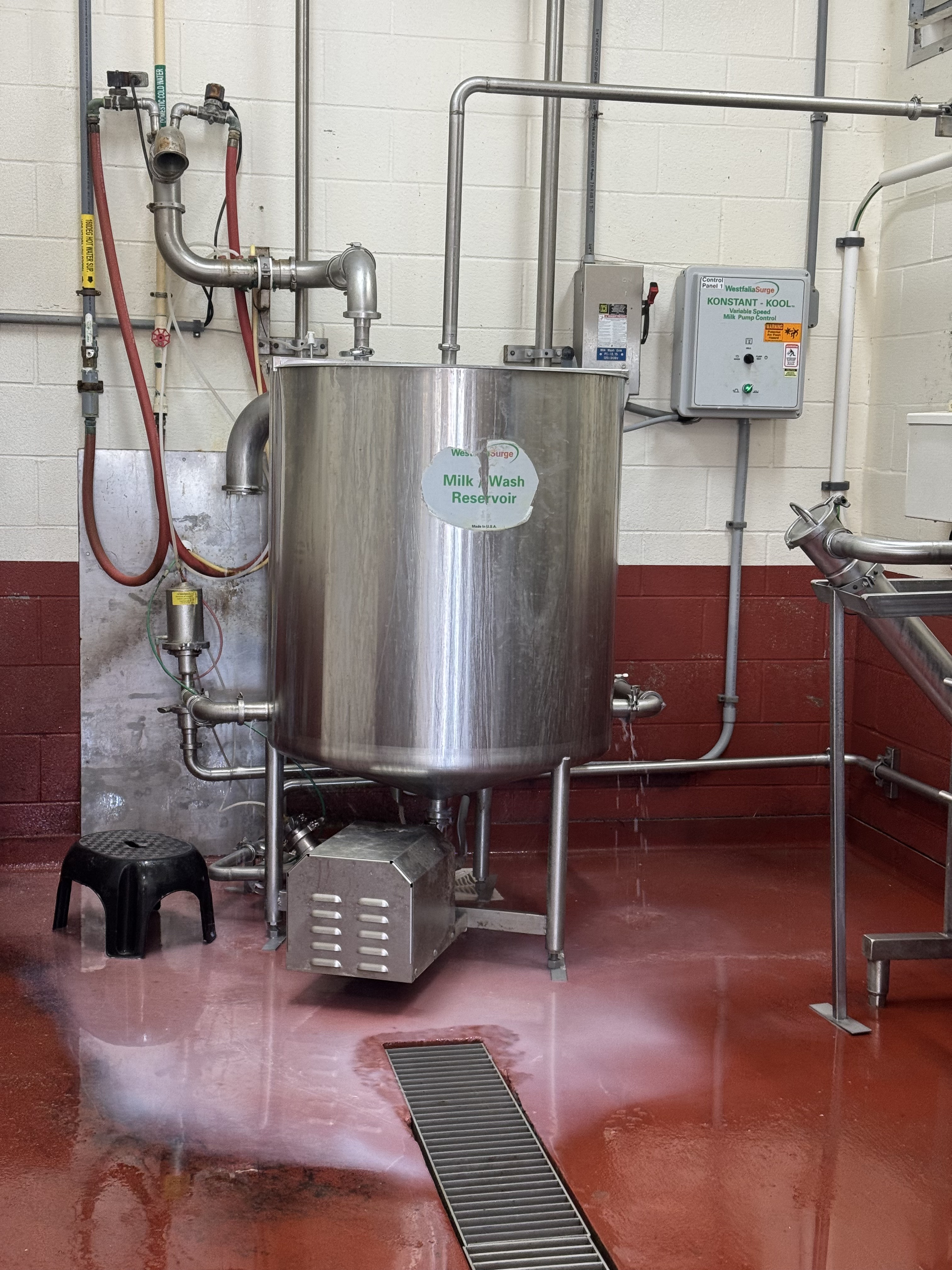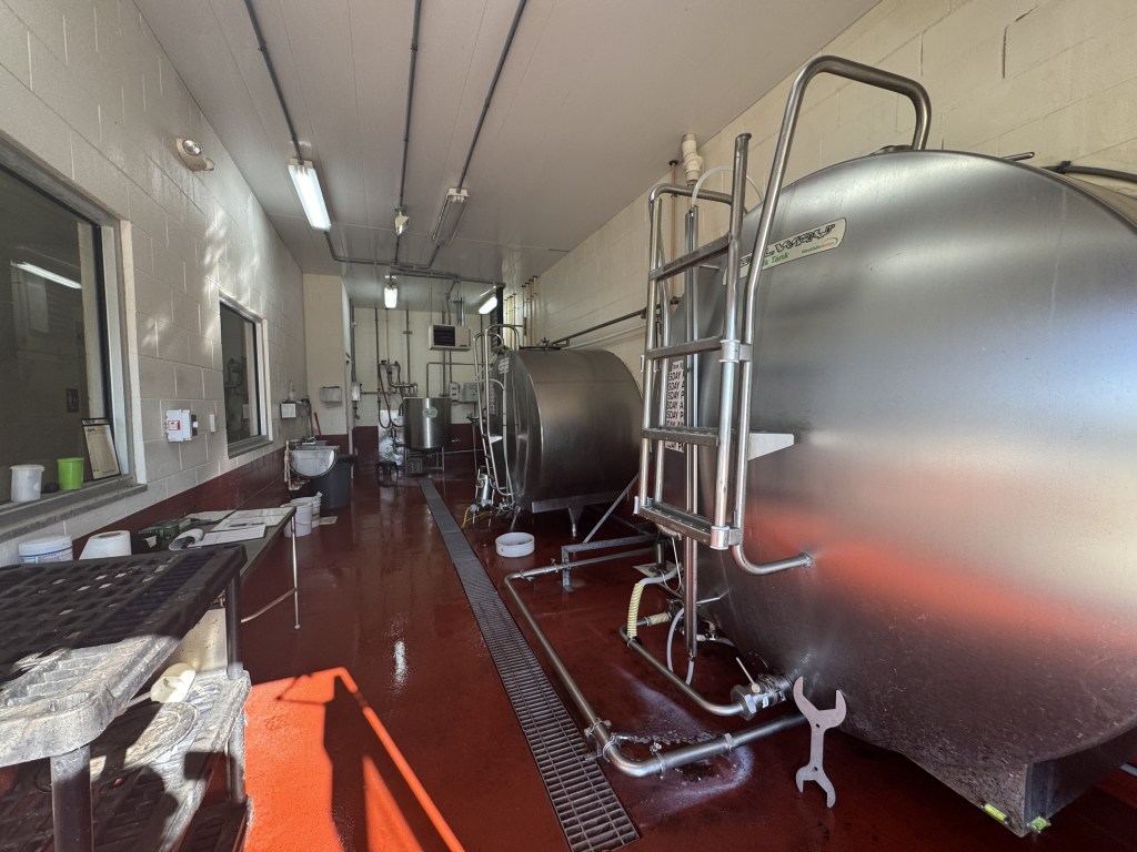 We then went into their reservoir room where the milk that the cows produce gets pumped into these huge tanks. One of the two tanks gets filled each day. Apparently, when the milk leaves the cow, it’s about 101.5 degrees! However for it to become milk, it needs to get down to refrigerated temperatures, so they have a machine that cools the milk to about 35 degrees in a matter of seconds. The cows produce about 7 gallons of milk each per day!